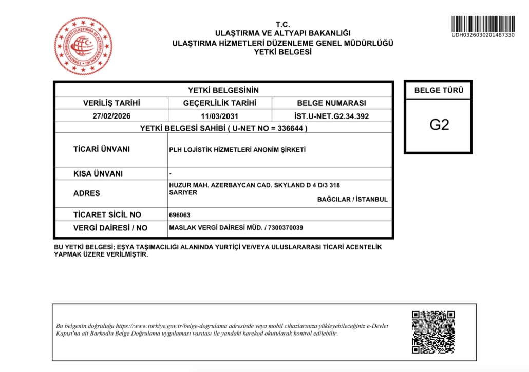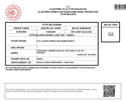 - G2 Yetki Belgesi (Eşya taşımacılığı alanında yurtiçi ve/veya uluslararası ticari acentelik)
